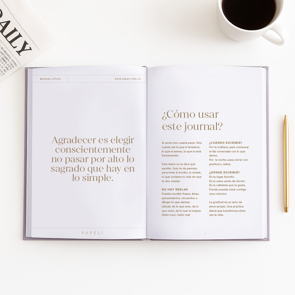 Sin preguntas ni estructuras, solo espacio libre para escribir, soltar y conectar contigo. Cada página es un recordatorio de que siempre hay algo por agradecer.